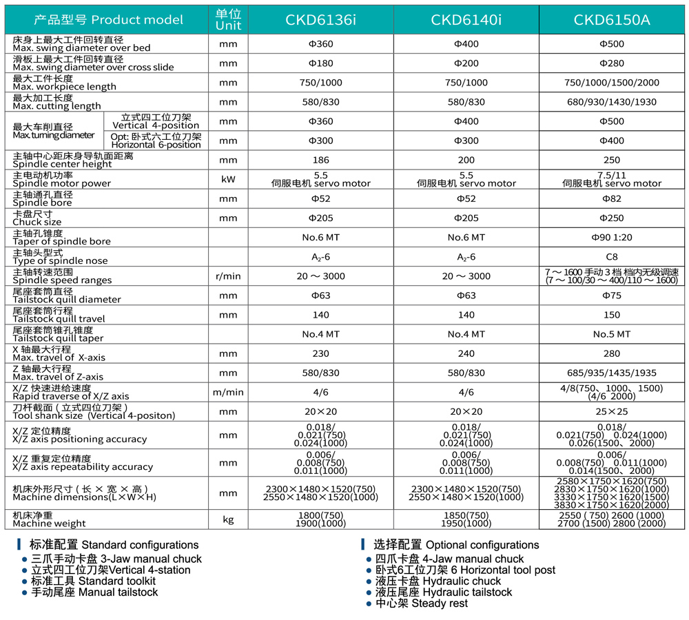 CKD系列数控车床为纵(Z)、横(X)两坐标控制的数控卧式车床。能够对各种轴类和盘类零件自动完成内外圆柱面、圆锥面、圆弧面、端面、切槽、倒角等工序的切削加工,并能进行公制直螺纹、端面螺纹及英制直螺纹和锥螺纹的车削加工。适合于多品种,中小批量产品的生产,对复杂、高精度零件尤能显示优越性。